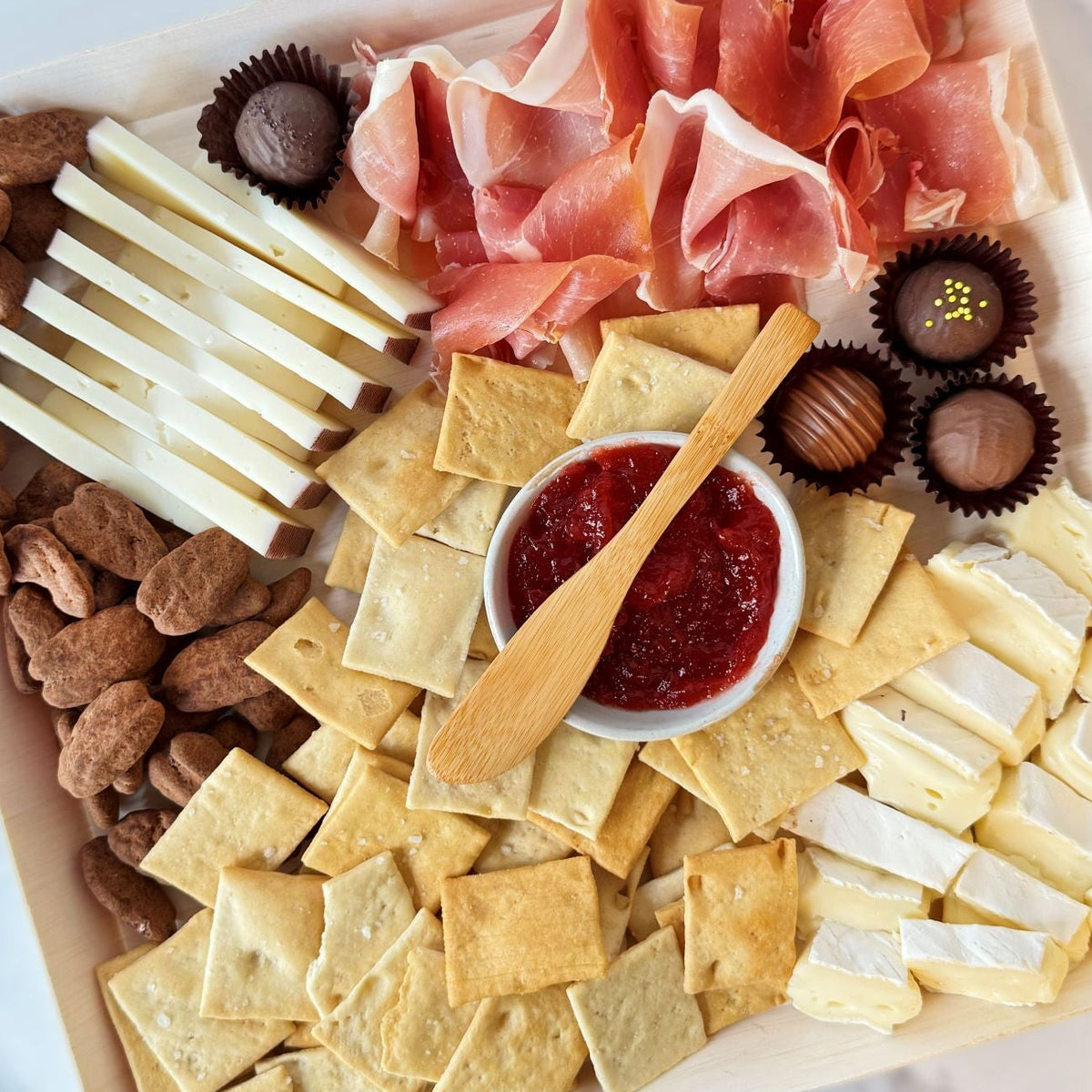 Cancel the res and light a candle. Our Date Night Bundle is your shortcut to a cozy, delicious night in—no dress code, no reservations, just you two and a spread that slaps. Imported Brie, Jamon Serrano, Strawberry & Prosecco Jam… it’s giving romance, it’s giving flavor, it's giving the kind of night you'll want to repeat.