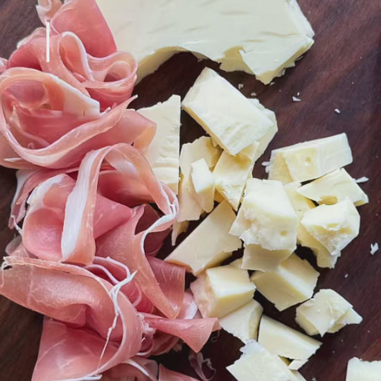- Prosciutto Italiano (3 oz) - This tender and savory Prosciutto is slow-cured in Parma for a minimum of 400 days, otherwise referred to as "four seasons." There's nothing in there other than all-natural pork ham and Mediterranean salt - and that's why we like it. It's as authentic as it gets.